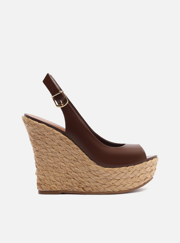 Sandália feminina marrom de couro. O sapato tem salto alto plataforma, revestido em corda trançada, e formato arredondado na ponta. Aberta atrás, possui recorte arredondado no cabedal e ponteira aberta. Possui tira larga contínua ao cabedal, que segue pelas laterais, contorna o calcanhar e fecha em fivela metálica. Com palmilha marrom e inscrição do nome da marca.