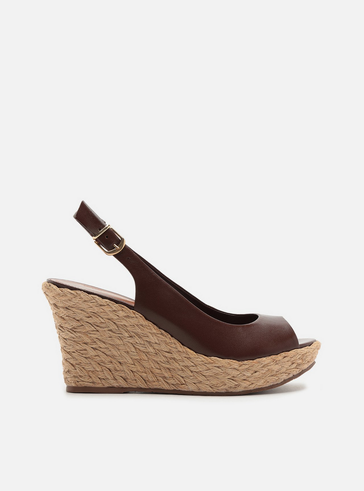 Sandália feminina marrom de couro. O sapato tem salto médio plataforma, revestido em corda trançada, e formato arredondado na ponta. Aberta atrás, possui recorte arredondado no cabedal e ponteira aberta. Possui tira larga contínua ao cabedal, que segue pelas laterais, contorna o calcanhar e fecha em fivela metálica. Com palmilha da cor da sandália e inscrição do nome da marca.