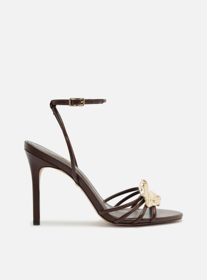Sandália feminina marrom de couro. O sapato tem salto alto fino e formato arredondado na ponta. Possui tiras finas sobre os dedos, adornadas por aplicação metálica em formato de folha. Possui tiras finas que saem das laterais, cruzam no calcanhar, contornam o tornozelo e fecham em fivela lateral. Com palmilha marrom e inscrição do nome da marca.
