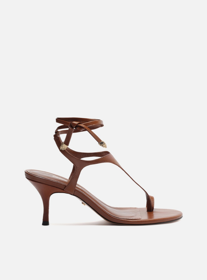Sandália feminina marrom de couro. O sapato tem salto médio fino e formato arredondado na ponta. Traz tira dividindo os dedos, que cobre parcialmente a parte superior do pé, e tira em torno do dedão. Possui tiras finas com ponteiras metálicas, conectadas à tira frontal, que contornam o tornozelo e fecham em amarração. Com palmilha da cor da sandália e inscrição do nome da marca.