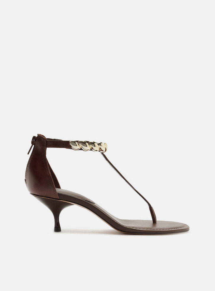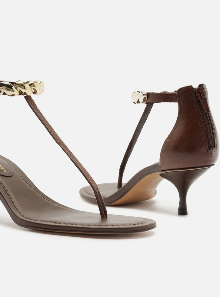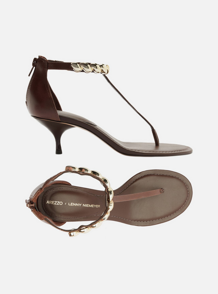 Sandália feminina marrom em couro. O sapato tem salto baixo fino e formato arredondado na ponta. Traz tira fina que divide os dedos, conectada à tira no tornozelo, com aplicação de metal dourado em efeito torcido. Fechada no calcanhar, possui zíper traseiro. Com palmilha da cor da sandália e inscrição Arezzo / Lenny Niemeyer. A sandália exibe todo o pé.