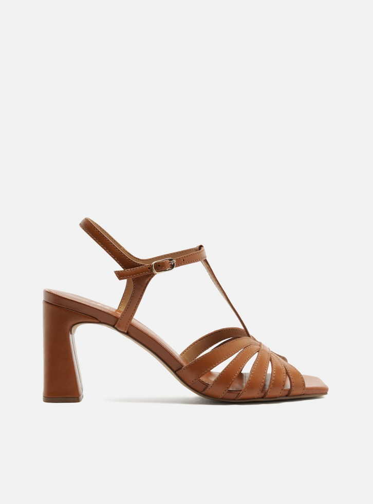 Sandália marrom em couro. O sapato tem salto médio bloco e formato quadrado na ponta. Traz tiras largas vazadas sobre os dedos e a parte superior do pé, conectadas por tira central. Possui tira fina em torno do calcanhar com fechamento em fivela lateral. Com palmilha marrom e inscrição do nome da marca.