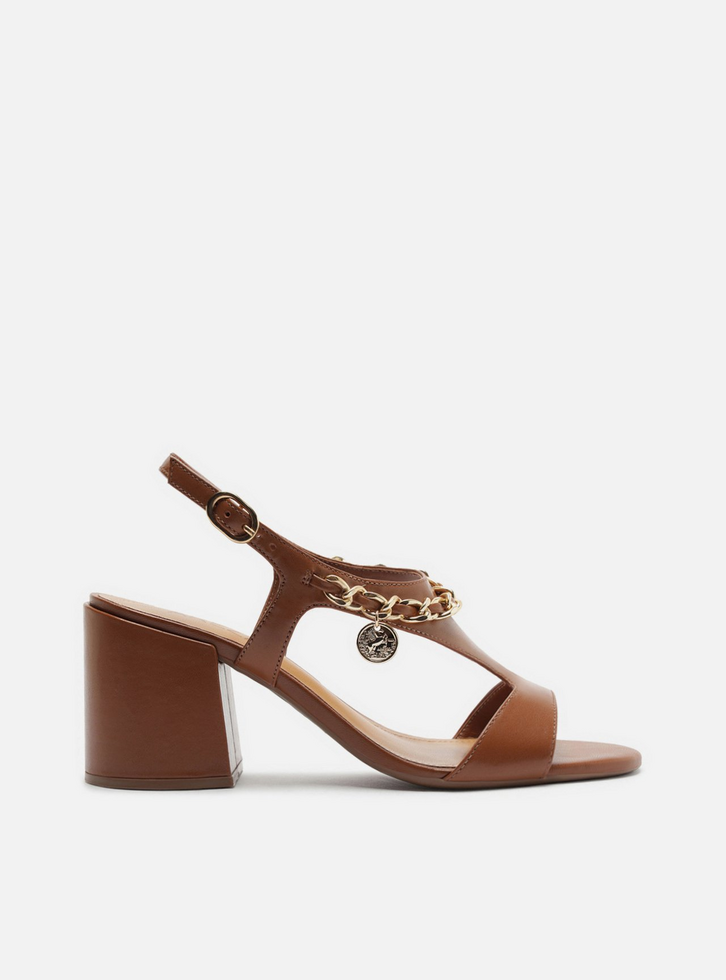 Sandália feminina marrom de couro. O sapato tem salto médio bloco e formato arredondado na ponta. Possui tira sobre os dedos conectada à tira central, que alarga na parte superior do pé, contorna o calcanhar e fecha em fivela metálica lateral. Traz aplicação de corrente metálica dourada e detalhe de charm vazado em formato de medalha. Com palmilha bege e inscrição do nome da marca.