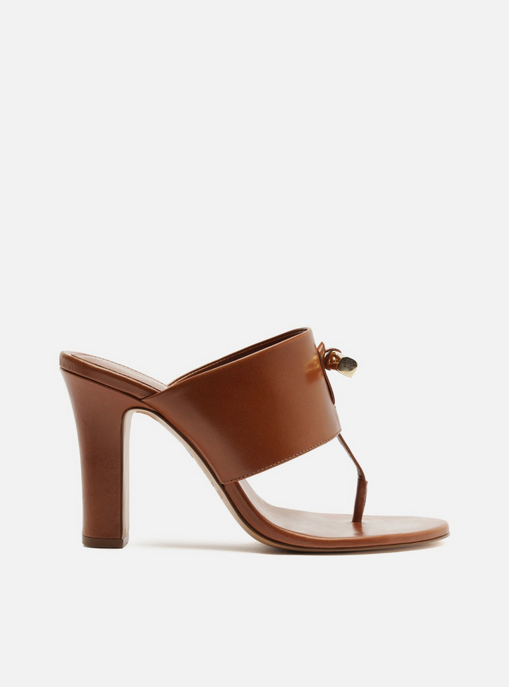 Sandália feminina marrom de couro. O sapato tem salto médio fino e formato arredondado na ponta. Traz tira larga na parte superior do pé, com detalhe em metal dourado, e tira fina dividindo os dedos. Com palmilha da cor da sandália e inscrição do nome da marca.