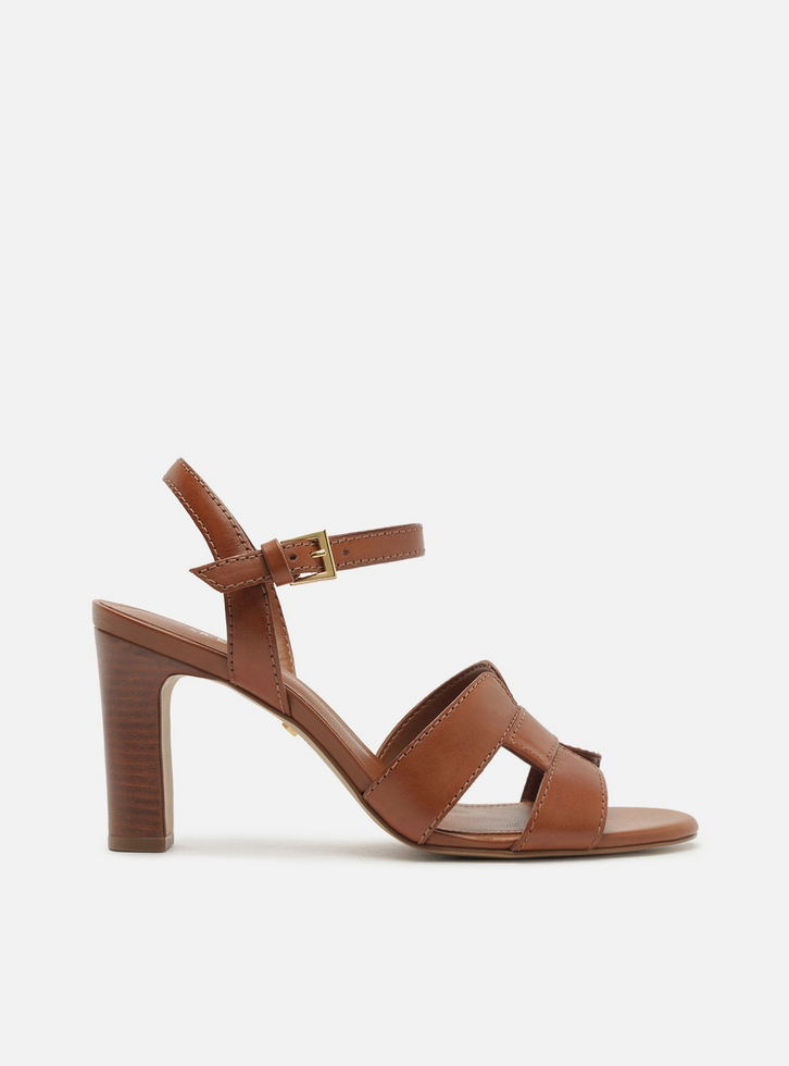 Sandália feminina marrom em couro. O sapato tem salto médio bloco revestido em fachete e formato arredondado na ponta. Possui cabedal em tiras vazadas e costuras em pesponto por todo o contorno. Aberta, traz tira no calcanhar e tira fina no tornozelo com fecho em fivela lateral. Com palmilha na cor do sapato e inscrição do nome da marca. A sandália exibe todo o pé.