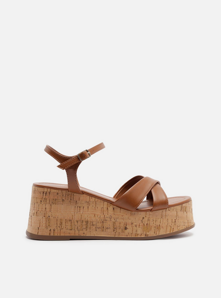 Sandália marrom. O sapato tem salto médio plataforma revestido em cortiça e formato arredondado na ponta. Traz duas tiras cruzadas sobre os dedos e tira fina afivelada no tornozelo, conectada ao calcanhar. Com palmilha marrom e inscrição do nome da marca. Aberta, exibe todo o pé.
