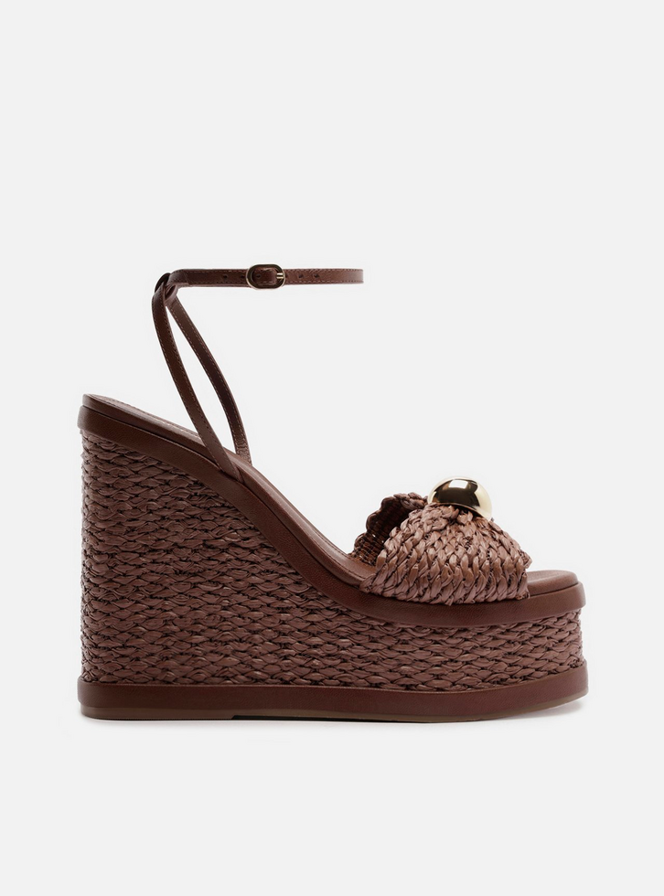 Sandália feminina marrom em material tramado. O sapato tem salto alto plataforma revestido no mesmo material e formato arredondado na ponta. Possui tira larga sobre os dedos, com leve franzido central e aplicação de esfera metálica dourada. Traz tiras finas que saem das laterais, cruzam no calcanhar, contornam o tornozelo e fecham em fivela lateral. Com palmilha marrom e inscrição do nome da marca.
