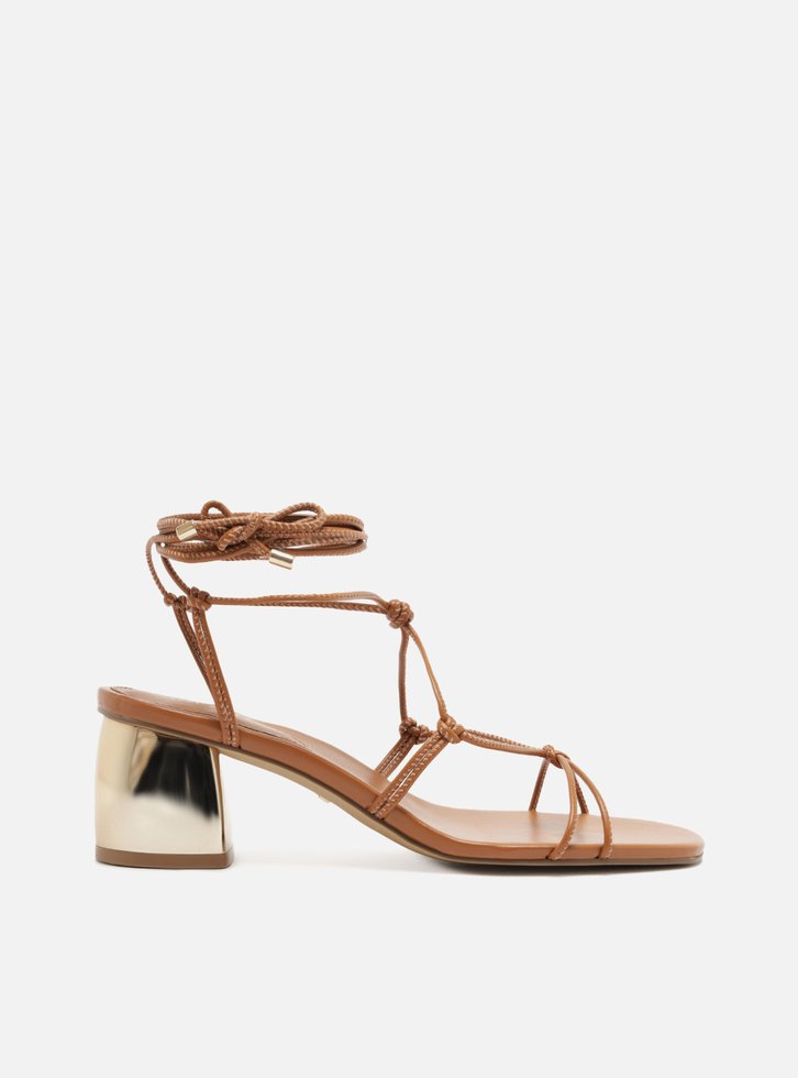 Sandália marrom. O sapato tem salto médio bloco e formato arredondado na ponta. Traz tiras finas entrelaçadas sobre os dedos com nós, e sobem na parte superior do pé, contornam o tornozelo e fecham em amarração superior. Com palmilha da cor da sandália e inscrição do nome da marca. A sandália exibe todo o pé.