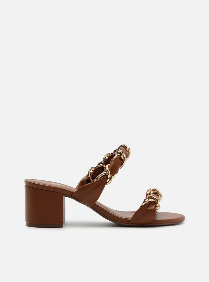 Sandália feminina marrom. O sapato tem salto médio bloco e formato arredondado na ponta. Traz duas tiras médias maleáveis sobre os dedos e a parte superior do pé, entrelaçadas por elos metálicos dourados. Aberta, exibe todo o pé. Com palmilha da cor da sandália e inscrição do nome da marca.