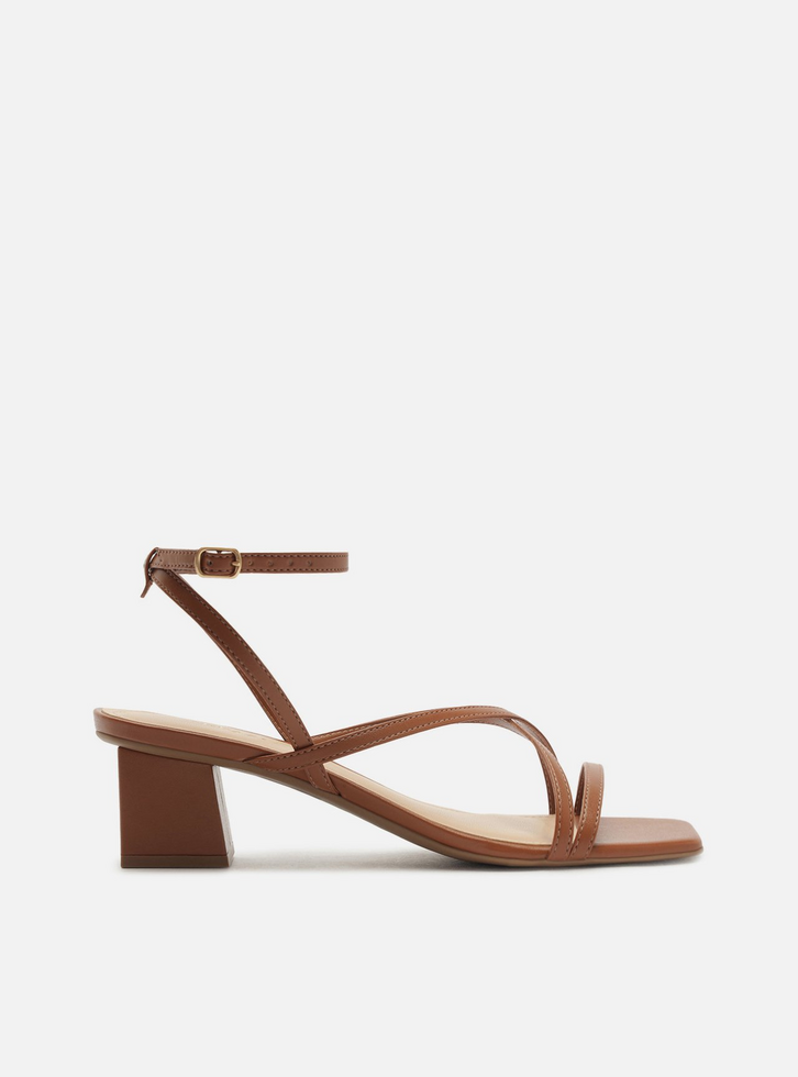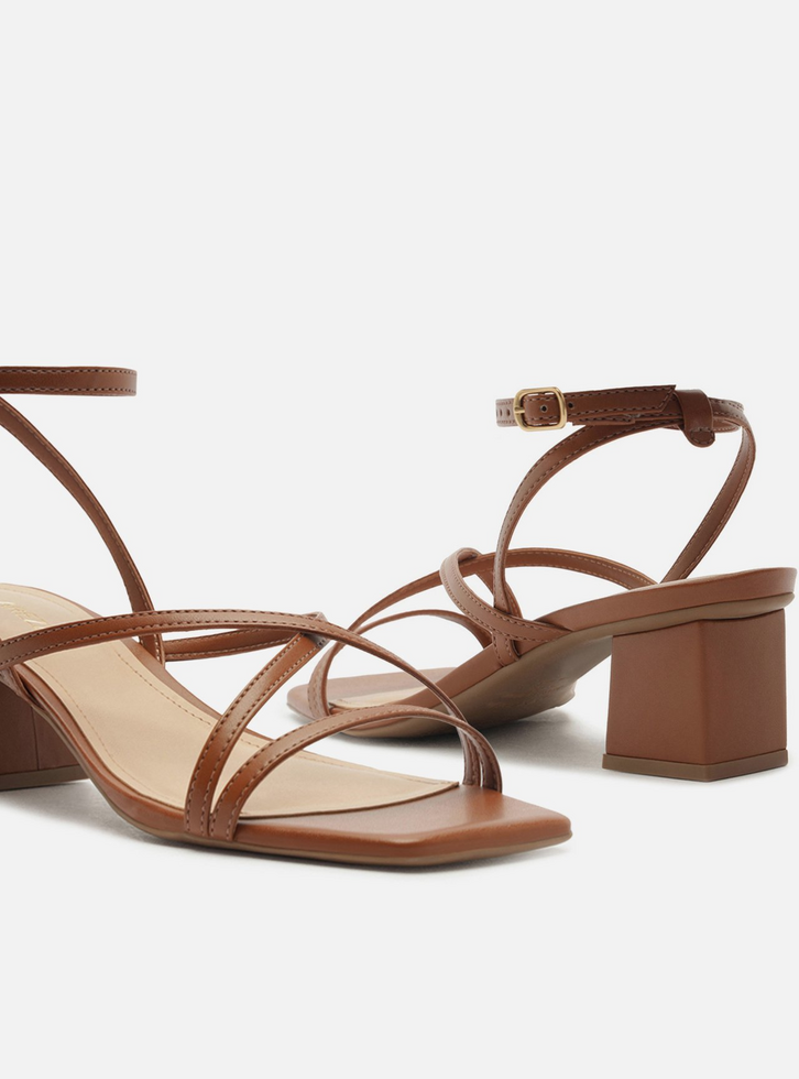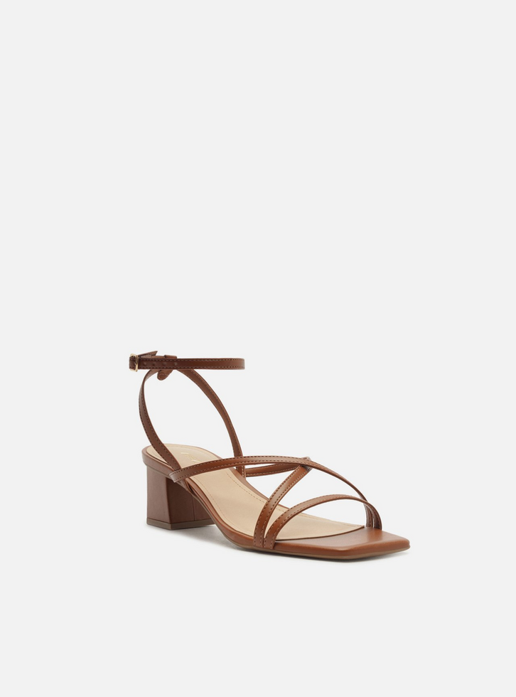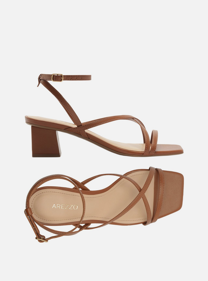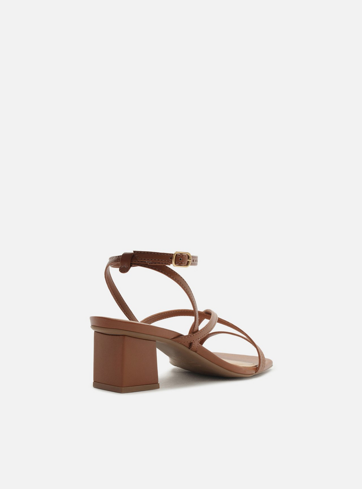 Sandália marrom. O sapato tem salto baixo bloco quadrado e ponta quadrada. Traz uma tira fina sobre os dedos e mais duas tiras finas cruzadas na parte superior do pé. Possui tiras finas que saem das laterais, cruzam no calcanhar, contornam o tornozelo e fecham em fivela lateral. Com palmilha bege e inscrição do nome da marca. A sandália exibe todo o pé.