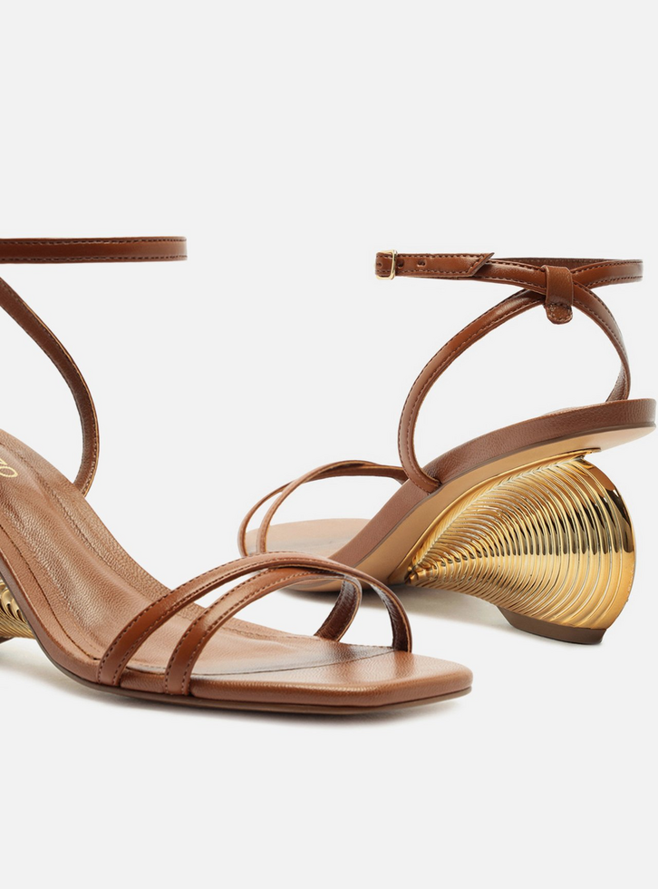 Sandália feminina marrom. O sapato tem salto médio geométrico dourado, inteiro e com textura de curvas, e formato quadrado na ponta. Traz tiras bem finas cruzadas sobre os dedos. Possui tira fina que sai das laterais, cruza no calcanhar, contorna o tornozelo e fecha em fivela lateral. Com palmilha da cor da sandália e inscrição do nome da marca. A sandália exibe todo o pé.