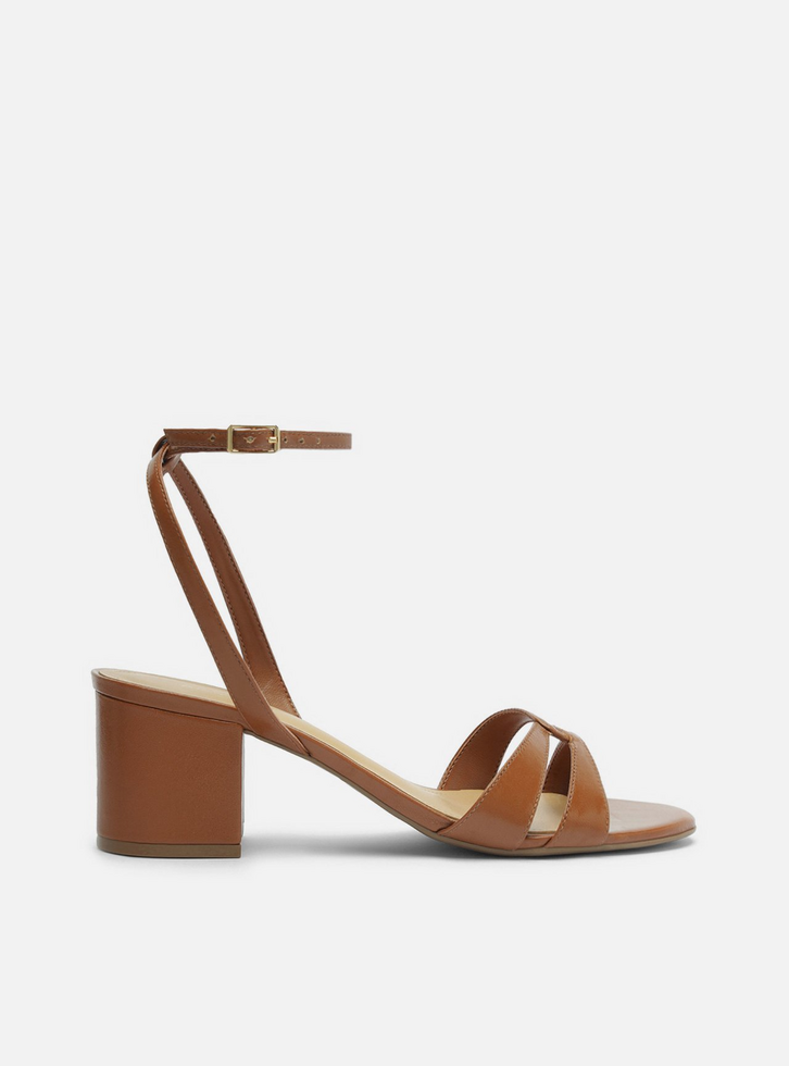 Sandália marrom. O sapato tem salto médio bloco e formato arredondado na ponta. Traz tiras médias sobre os dedos, com detalhe em enlace central. Possui tira fina que sai das laterais, cruza no calcanhar, contorna o tornozelo e fecha em fivela lateral. Com palmilha bege e inscrição do nome da marca.