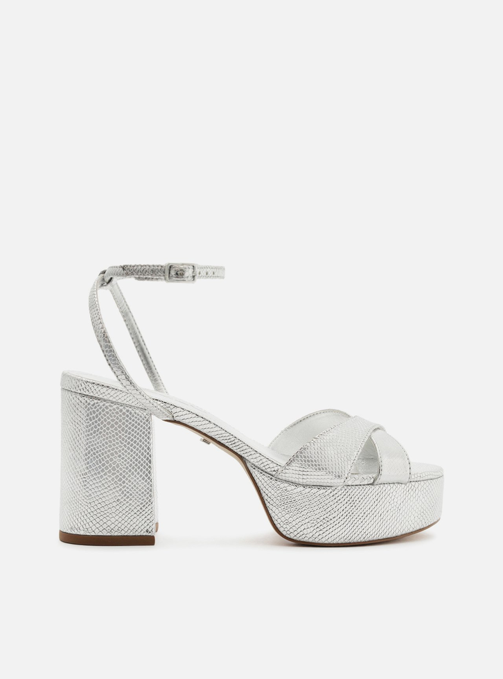 Sandália feminina prata com acabamento texturizado. O sapato tem salto alto bloco, meia pata e formato quadrado na ponta. Traz duas tiras cruzadas sobre os dedos. Possui tira fina que sai das laterais, se cruza no calcanhar, contorna o tornozelo e fecha em fivela lateral. Com palmilha bege e inscrição do nome da marca. A sandália exibe todo o pé.