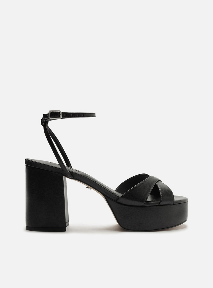 Sandália feminina preta de couro. O sapato tem salto alto bloco, meia pata e formato quadrado na ponta. Traz duas tiras cruzadas sobre os dedos. Possui tira fina que sai das laterais, se cruza no calcanhar, contorna o tornozelo e fecha em fivela lateral. Com palmilha bege e inscrição do nome da marca. A sandália exibe todo o pé.