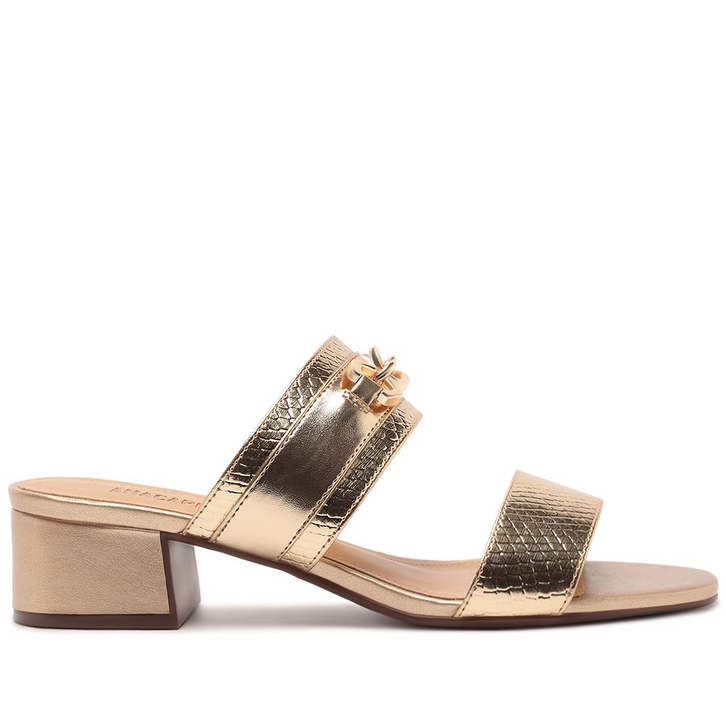 Sandália mule de salto bloco, com detalhe em elos metálicos, na cor dourada. O modelo apresenta cabedal em material similar ao couro, com efeito texturizado e metalizado. Possui duas tiras - uma sobre os dedos, outra mais larga sobre o peito de pé, com detalhe imponente em aplicação de tira sobreposta, com maxi elos metálicos - estilo corrente na tira traseira. De biqueira quadrada, possui salto em bloco médio e palmilha comfy, com assinatura Anacapri. Aberta atrás, a sandália mule deixa os dedos e calcanhar à mostra.