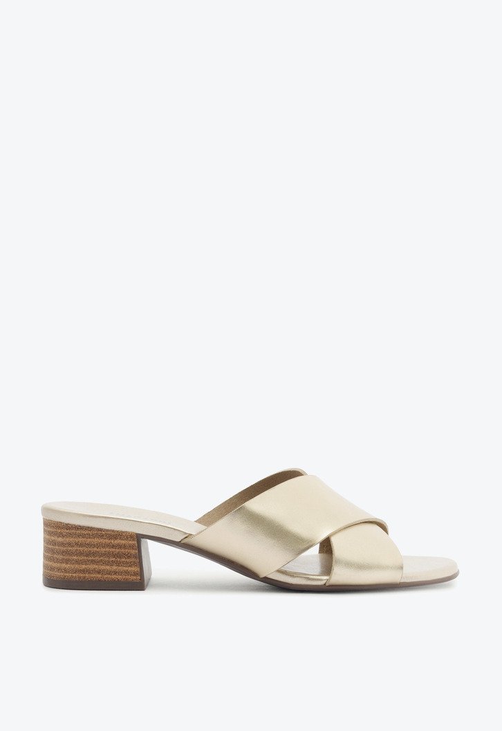 Sandália mule de salto bloco e tiras cruzadas, na cor dourada. O modelo de material de couro, possui salto em bloco médio. Apresenta cabedal em duas tiras mais largas - que se cruzam em design de “X” - sobre os dedos e peito de pé. De biqueira quadrada, traz palmilha de mesmo tom da peça, com assinatura Anacapri. Aberta atrás, a sandália mule deixa os dedos e o calcanhar totalmente à mostra.