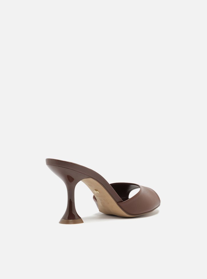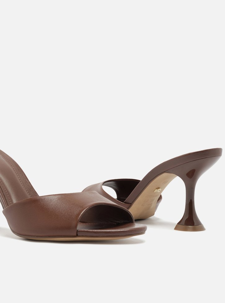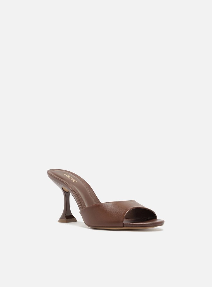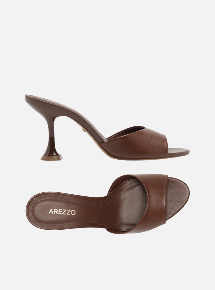 Mule marrom. O modelo tem salto médio geométrico, e bico redondo. Traz tira larga e única sobre os dedos e a parte superior do pé. Com palmilha na cor do modelo e inscrição do nome da marca.