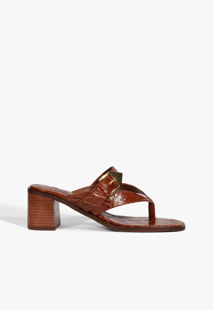 Sandália em couro croco, com cabedal em V e toe ring, detalhe de tira horizontal com fivela decorativa, bico quadrado e salto bloco.