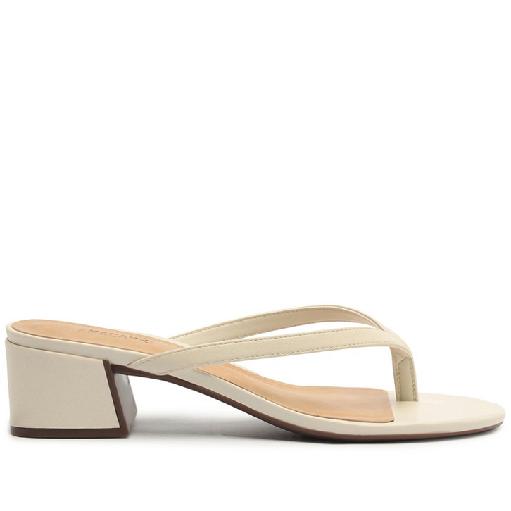 Sandália de salto bloco com duas tiras, na cor branca. O modelo possui salto em bloco baixo e biqueira arredondada. Traz cabedal com duas tiras centrais que passam entre os dedos e seguem pelas laterais. Aberta atrás, com palmilha comfy nude e assinatura Anacapri.