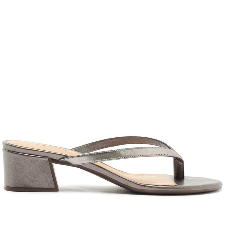 Sandália de salto bloco com duas tiras, na cor prateada. O modelo possui salto em bloco baixo e biqueira arredondada. Traz cabedal com duas tiras centrais que passam entre os dedos e seguem pelas laterais. Aberta atrás, com palmilha comfy nude e assinatura Anacapri.