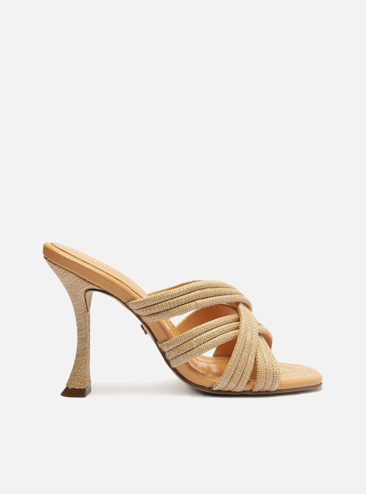 Sandália bege em fibra natural. O modelo tem salto alto fino taça bege e bico quadrado. Traz tiras bombadas e triplas, cruzadas sobre os dedos e o peito do pé. Com palmilha marrom, estofada, com costuras pesponto e inscrição do nome da marca. A sandália exibe parte do pé.