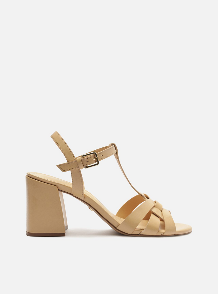 Sandália Nude Couro Salto Bloco Tiras Elo