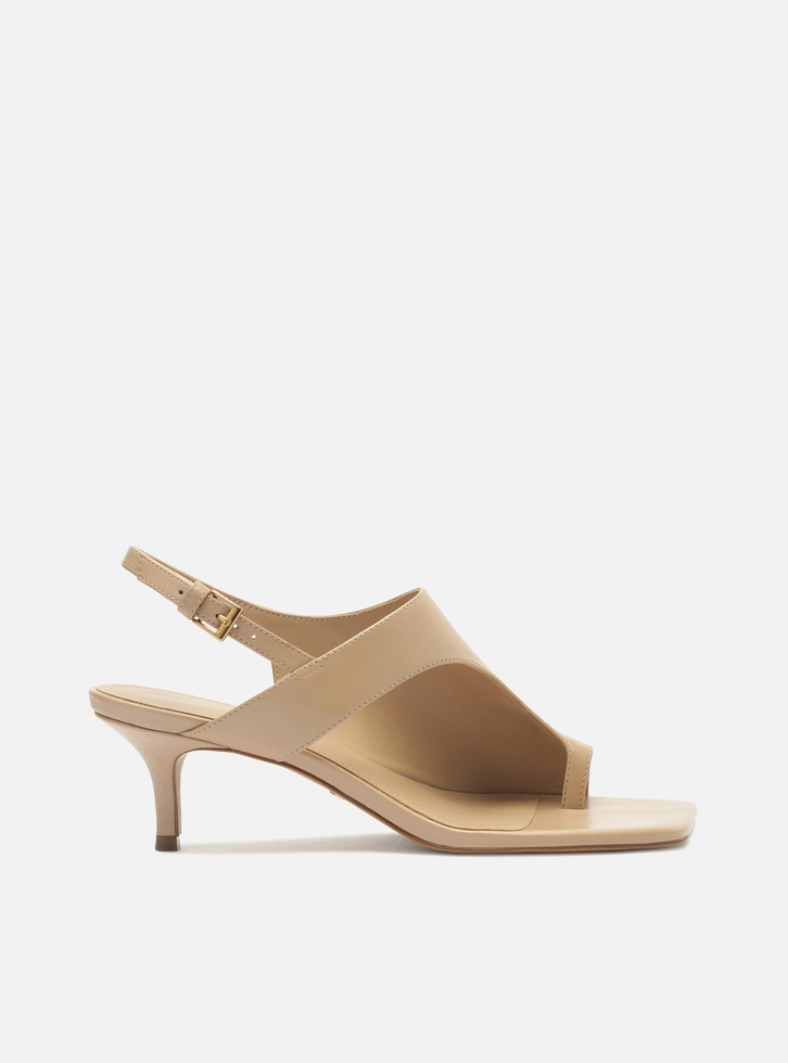 Sandália feminina nude em couro. O sapato tem salto médio fino e bico quadrado. Traz tira larga sobre o peito do pé e tira em torno do dedão. Possui tira fina que contorna o tornozelo e fecha em fivela lateral. Com palmilha da cor da sandália e inscrição do nome da marca. A sandália exibe grande parte do pé.