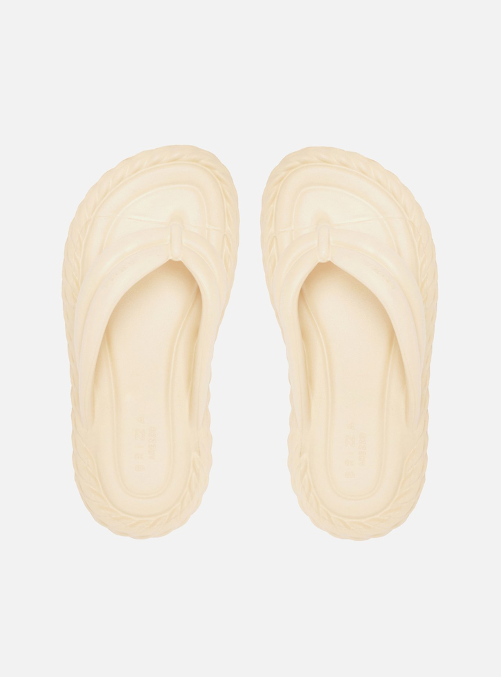 Sandália feminina nude em EVA. O sapato tem salto baixo, solado plataforma em relevo que imita tiras de cordão torcido e palmilha estofada lisa. Com formato arredondado na ponta, traz tiras estofadas duplas dividindo os dedos e com nome da marca em uma delas. Aberta, exibe todo o pé.