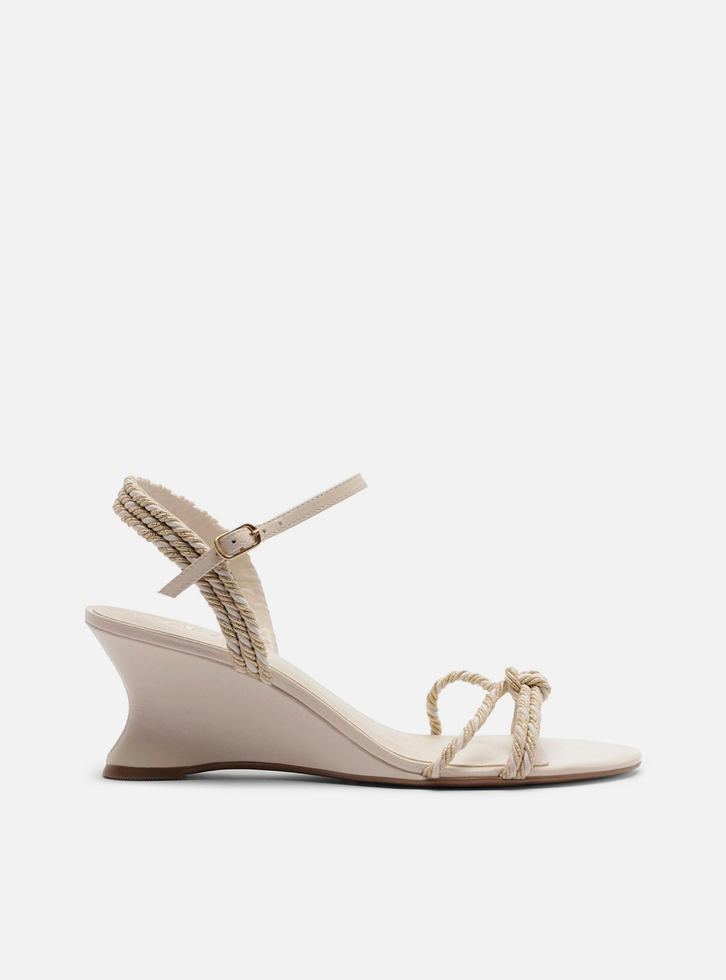 Sandália off-white. O sapato tem salto médio anabela levemente curvo e formato arredondado na ponta. Traz tiras finas em cordão torcido com fios metalizados sobre os dedos com nó. Possui tira no calcanhar, tira afivelada no tornozelo e palmilha off-white com inscrição do nome da marca.