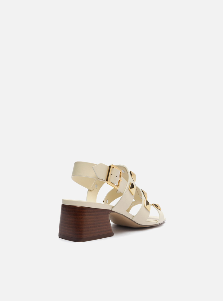 Sandália Off-white de couro. O modelo tem salto baixo bloco em fachete e bico quadrado. Traz tiras no cabedal, cobrindo parte dos dedos e do peito do pé, sendo uma central e as demais horizontais, conectadas e com aplicação de tachas metálicas. Possui ainda tira em torno do calcanhar, fechando em fivela lateral. Aberta, tem palmilha da cor do modelo com nome da marca e exibe parte do pé.