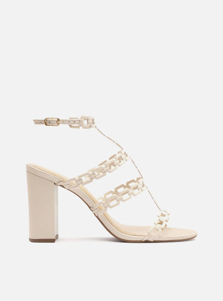 Sandália off white. O sapato tem salto alto bloco e formato arredondado na ponta. Traz tiras compostas por elos geométricos conectados, formando o cabedal em estilo gladiadora. Possui tira fina no tornozelo com fecho em fivela lateral. Com palmilha off white e inscrição do nome da marca. Aberta, exibe todo o pé.