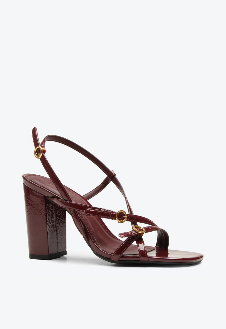 Sandália feminina de salto alto em verniz bordô. Com tiras finas e design clean, essa sandália une leveza e elegância em um modelo atemporal. Traz construções com sola injetada que garantem conforto no uso diário. Um essencial versátil, perfeito para quem busca praticidade com um toque refinado.