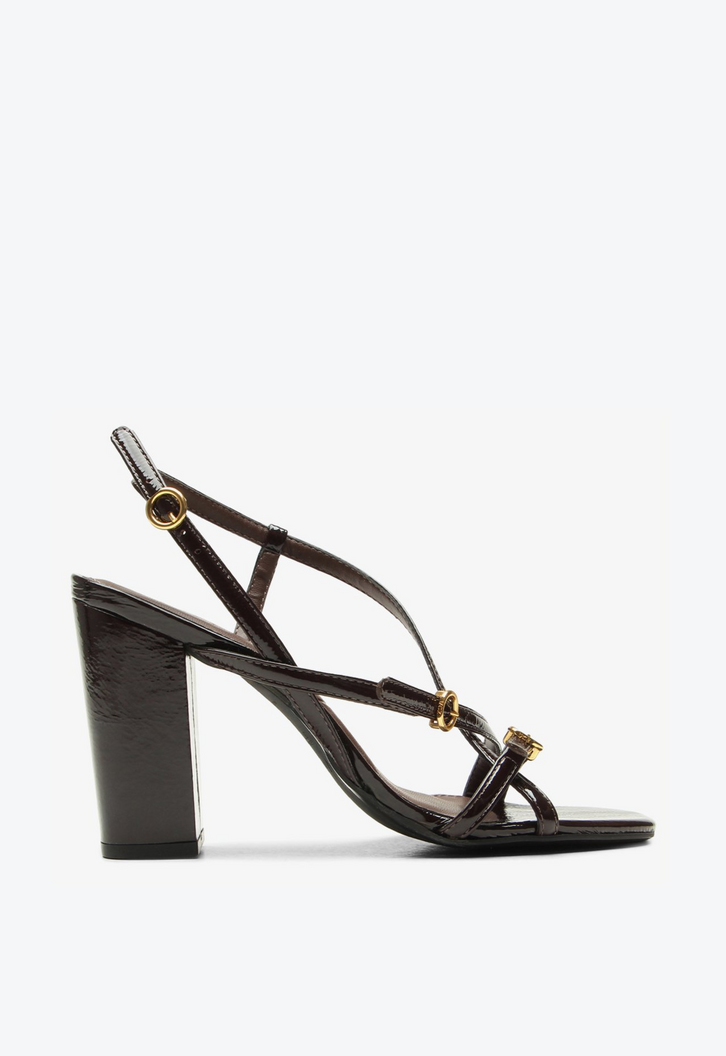 Sandália feminina de salto alto em verniz marrom. Com tiras finas e design clean, essa sandália une leveza e elegância em um modelo atemporal. Traz construções com sola injetada que garantem conforto no uso diário. Um essencial versátil, perfeito para quem busca praticidade com um toque refinado.