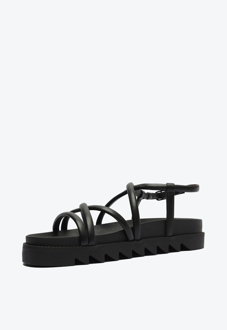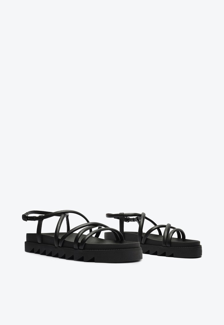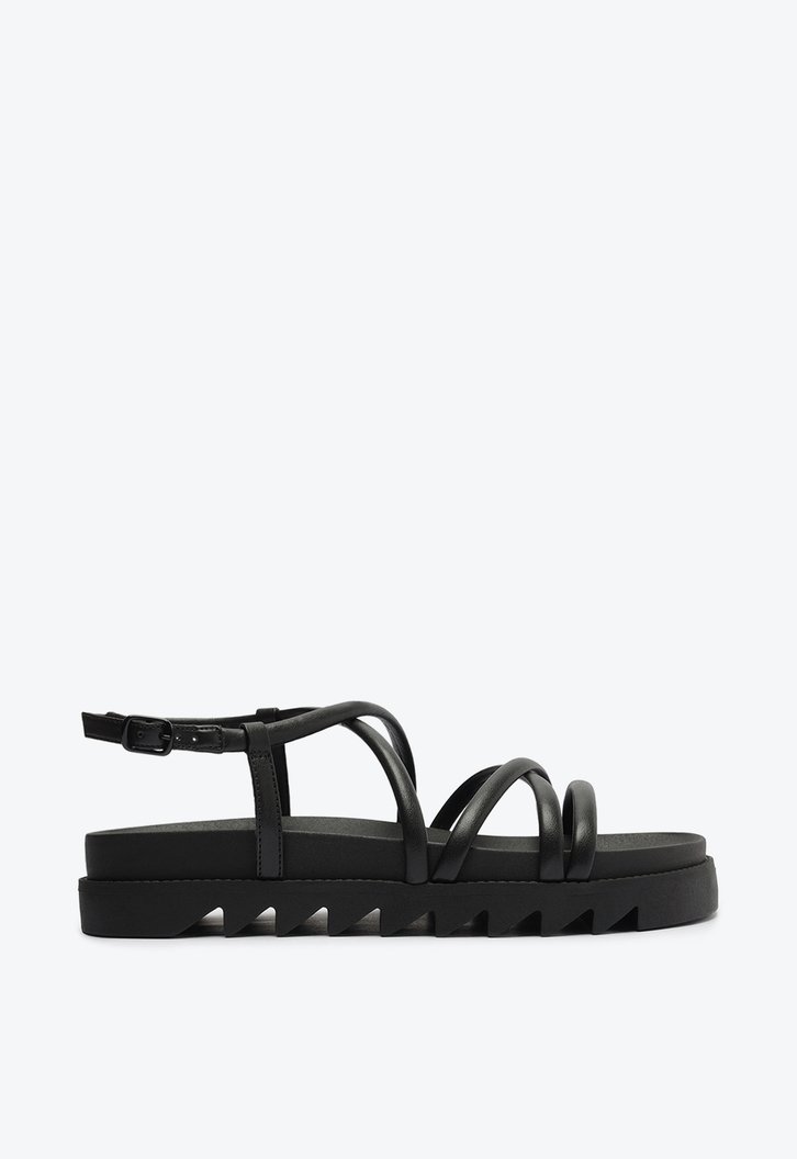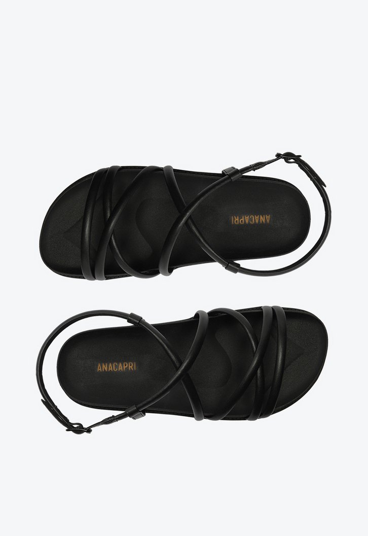 Sandália papete Anacapri multitiras preta. O modelo de biqueira arredondada traz cabedal em tirinhas transpassadas sobre os dedos e outras duas presas pelas laterais que se cruzam no peito de pé, unindo-se em uma tira que contorna o calcanhar, com fecho superior em fivela lateral. Apresenta solado emborrachado tratorado e palmilha anatômica da mesma cor da papete, com assinatura Anacapri.