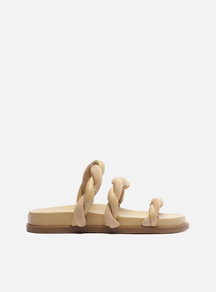 Sandália papete bege em nobuck. O modelo tem salto rasteiro, palmilha com formato anatômico e inscrição do nome da marca. Possui solado flatform, base emborrachada e formato arredondado na ponta. Traz três tiras largas e trançadas sobre os dedos e na parte superior do pé.