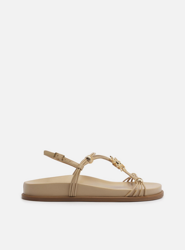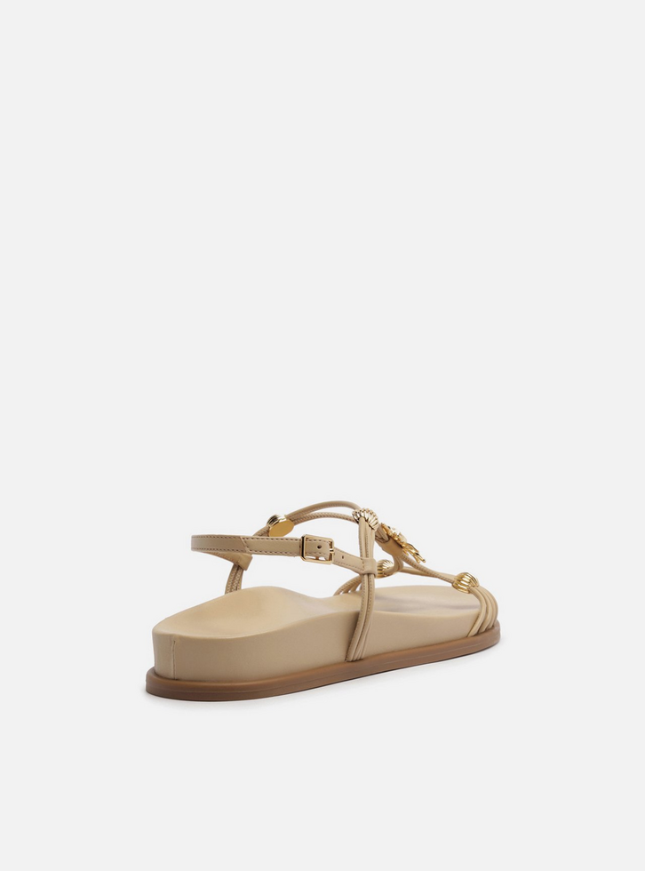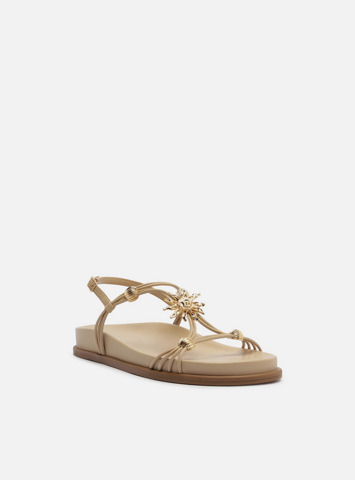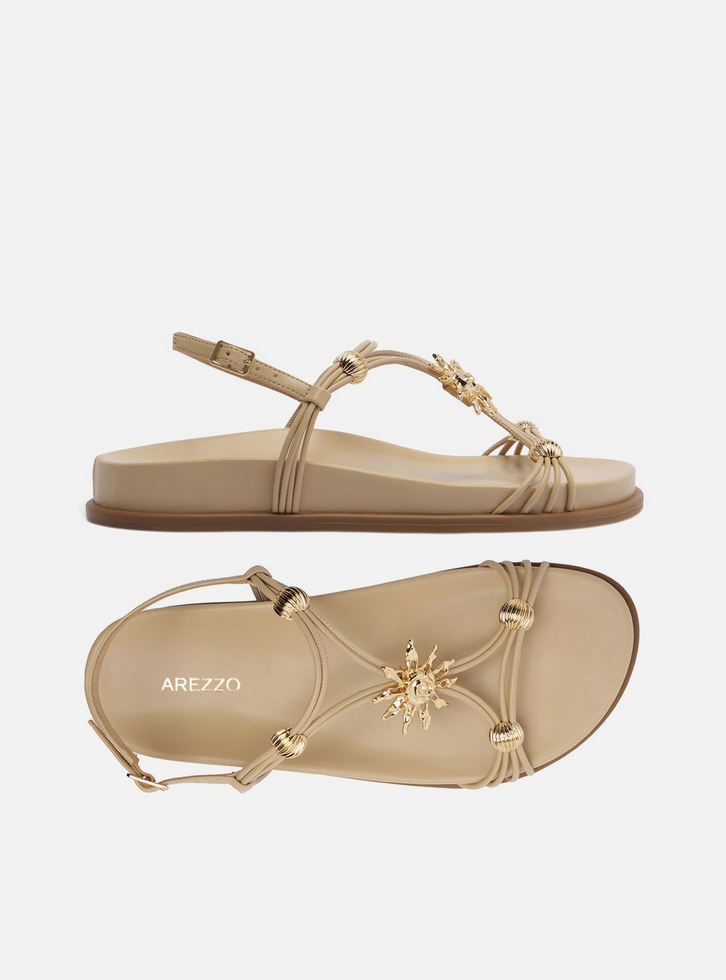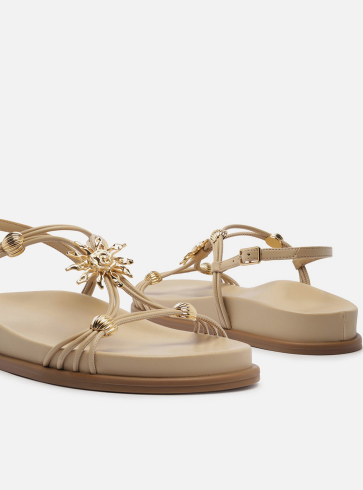 Sandália papete feminina bege. O sapato tem salto rasteiro, palmilha com formato anatômico e gravação do nome da marca. Possui solado flatform, base emborrachada e formato arredondado na ponta. Traz tiras finas sobre os dedos e na parte superior do pé, conectadas por metais dourados, sendo o central em formato de sol. Possui tira fina no calcanhar conectada à tira no tornozelo, com fecho em fivela lateral.