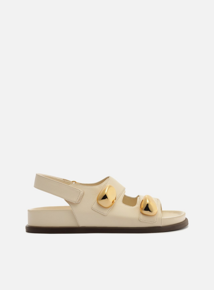 Sandália papete branca em couro. O sapato tem solado flatform e base emborrachada, com bico redondo. Traz duas tiras largas que se cruzam no peito do pé, com aplicação de dois metais arredondados na cor dourada. Possui tira larga no calcanhar com fechamento em velcro na lateral. Com palmilha na cor do modelo e inscrição do nome da marca.