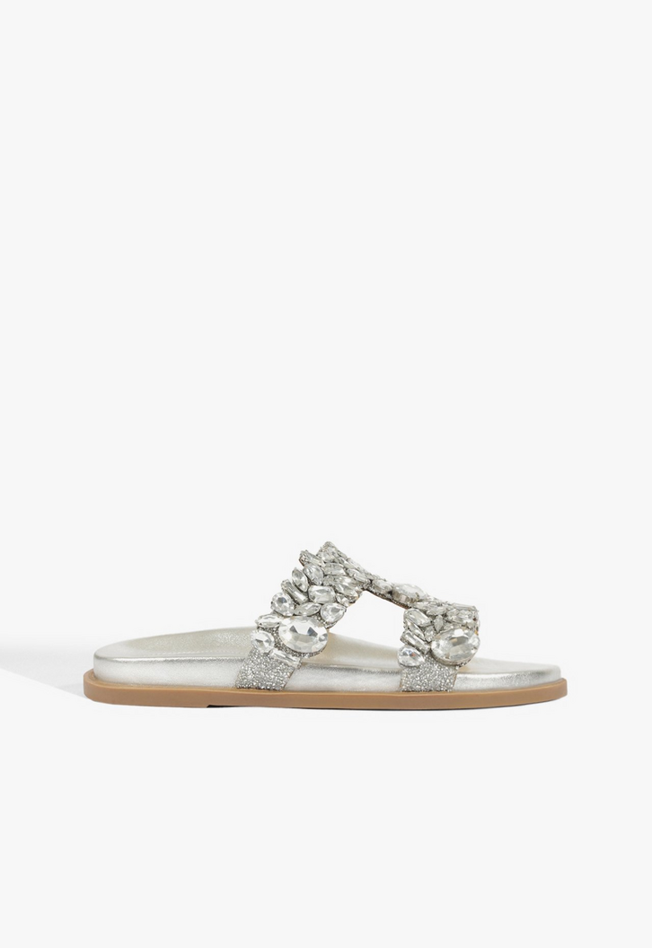 Essa papete rasteira traz um visual luxuoso surpreendente! Confortável com sua palmilha anatômica, ela se destaca por suas aplicações de pedras e bordados. Fácil de calcar com seu design slide, essa papete prateada vai ser uma aposta prática e estilosa para elevar seus looks!