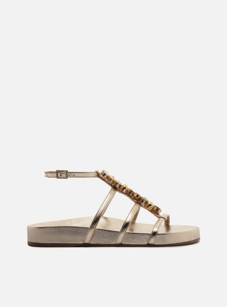 Sandália rasteira feminina dourada de couro. O sapato tem palmilha lisa com formato anatômico e gravação do nome da marca. Possui solado flatform, base emborrachada e formato arredondado na ponta. Traz tiras finas no cabedal, sobre os dedos e a parte superior do pé, sendo uma central com pedrarias e as demais horizontais, todas conectadas. Possui tira em torno do tornozelo, fechando em fivela lateral.