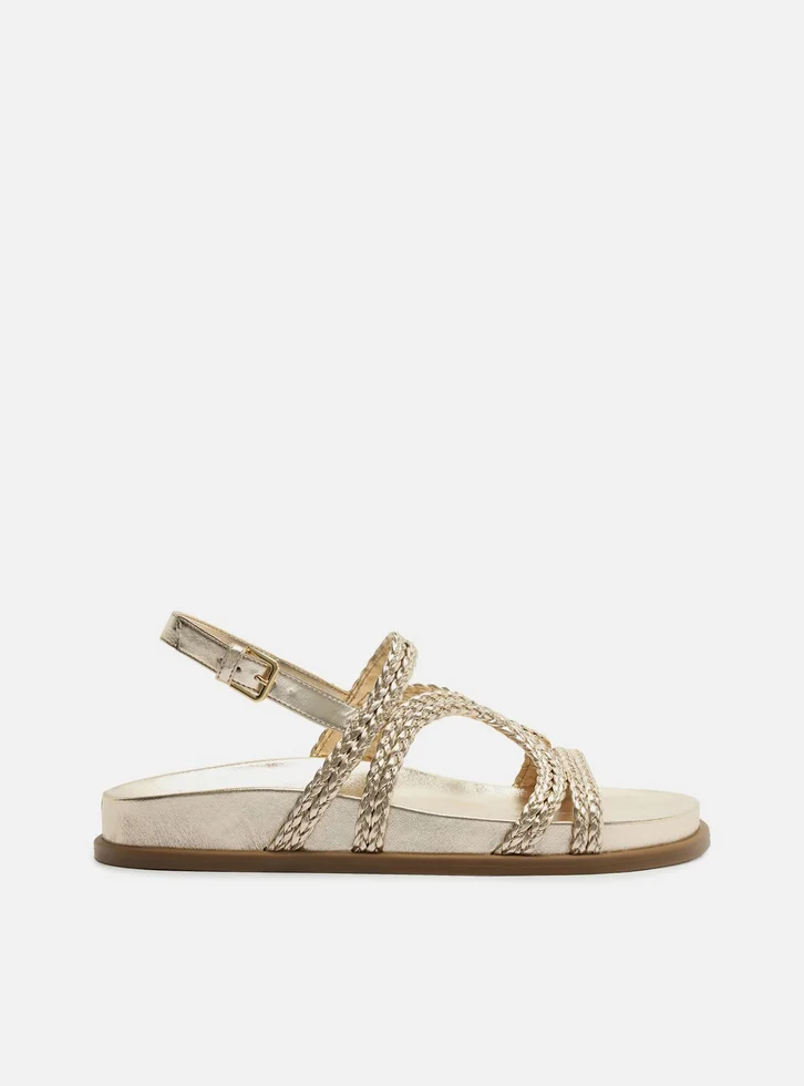 Sandália papete dourada. O sapato tem palmilha com formato anatômico e inscrição do nome da marca. Possui solado flatform, base emborrachada e formato arredondado na ponta. Traz tiras trançadas, uma sobre os dedos, outras duas que se unem no centro e mais uma na parte superior do pé, além de tira no calcanhar com fivela lateral ajustável. Aberta, a sandália exibe todo o pé.