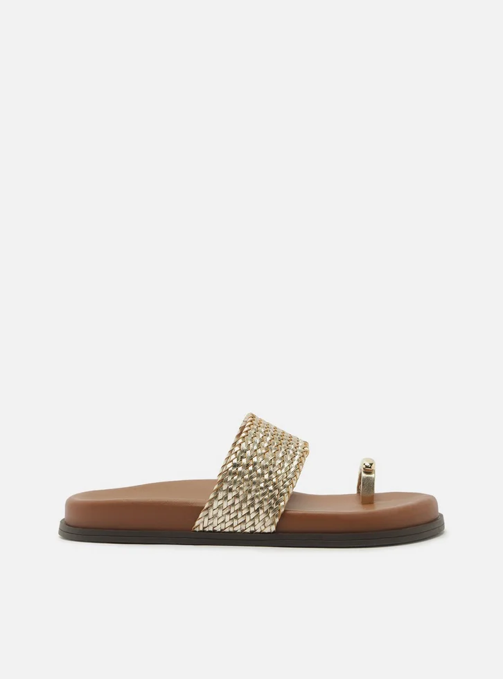 Sandália papete feminina dourada. O sapato tem salto rasteiro, palmilha marrom com formato anatômico e inscrição do nome da marca. Possui solado flatform, base emborrachada e formato arredondado na ponta. Traz tira larga em tressê na parte superior do pé e tira em torno do dedão com aplicação de metal dourado.