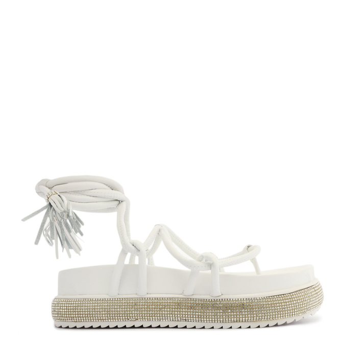 Com visual artesanal contrastando com a malha revestida de brilhos, essa sandália papete branca traz um mix irreverente com sua construção sporty. Tem tiras no cabedal e fechamento em amarração com ponteiras de barbicacho, combinação que só a Schutz sabe fazer!