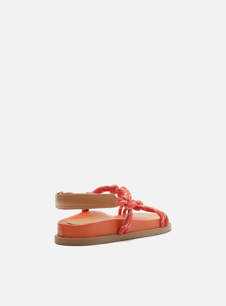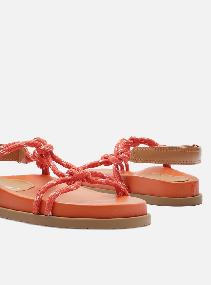 Sandália papete feminina laranja em couro. O sapato tem salto rasteiro, palmilha com formato anatômico e inscrição do nome da marca. Possui solado flatform, base emborrachada e formato arredondado na ponta. Traz tiras em cordão, que passam sobre os dedos e na parte superior do pé, unidas por tira central com nós e nós nas laterais, conectadas ainda a tira de couro marrom no calcanhar e fechando em velcro. Acompanha um conjunto com duas tornozeleiras em cordão colorido, uma delas trançada e com pingente metálico e a outra lisa.