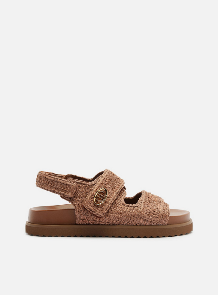 Sandália papete feminina marrom em material bordado. O sapato tem salto rasteiro, solado flatform e base tratorada emborrachada. Possui formato arredondado na ponta. Traz fecho em tiras largas com velcro na parte superior do pé e no calcanhar, além de tira sobre os dedos. Detalhe em metal geométrico em uma das tiras. Com palmilha marrom e inscrição do nome da marca.
