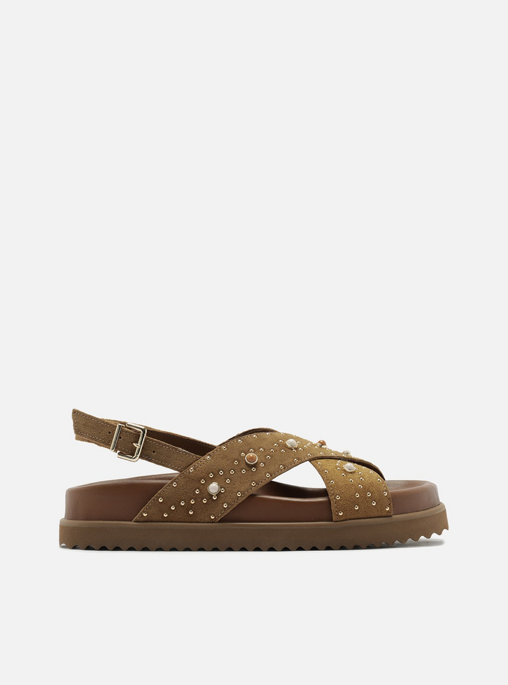 Sandália Papete Marrom Clara Acamurçada Aplicações