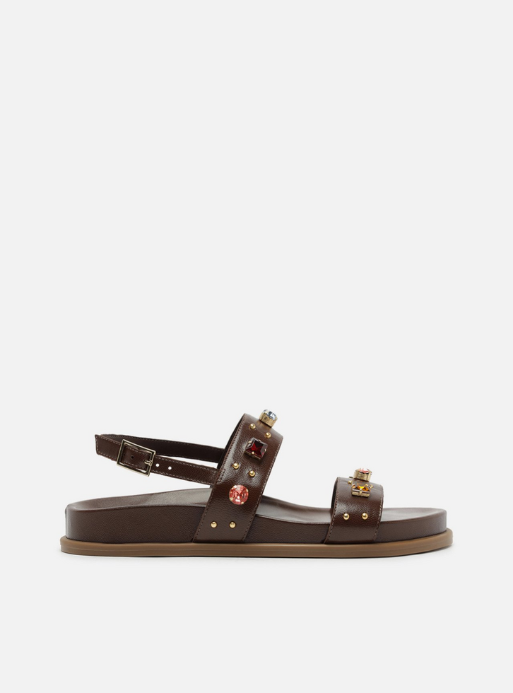 Sandália papete feminina marrom de couro. O sapato tem salto rasteiro, palmilha com formato anatômico e inscrição do nome da marca. Possui solado flatform, base emborrachada e formato arredondado na ponta. Traz tira larga sobre os dedos e tira na parte superior do pé, ambas com aplicação de pedrarias coloridas e rebites dourados, conectada à tira afivelada no calcanhar.