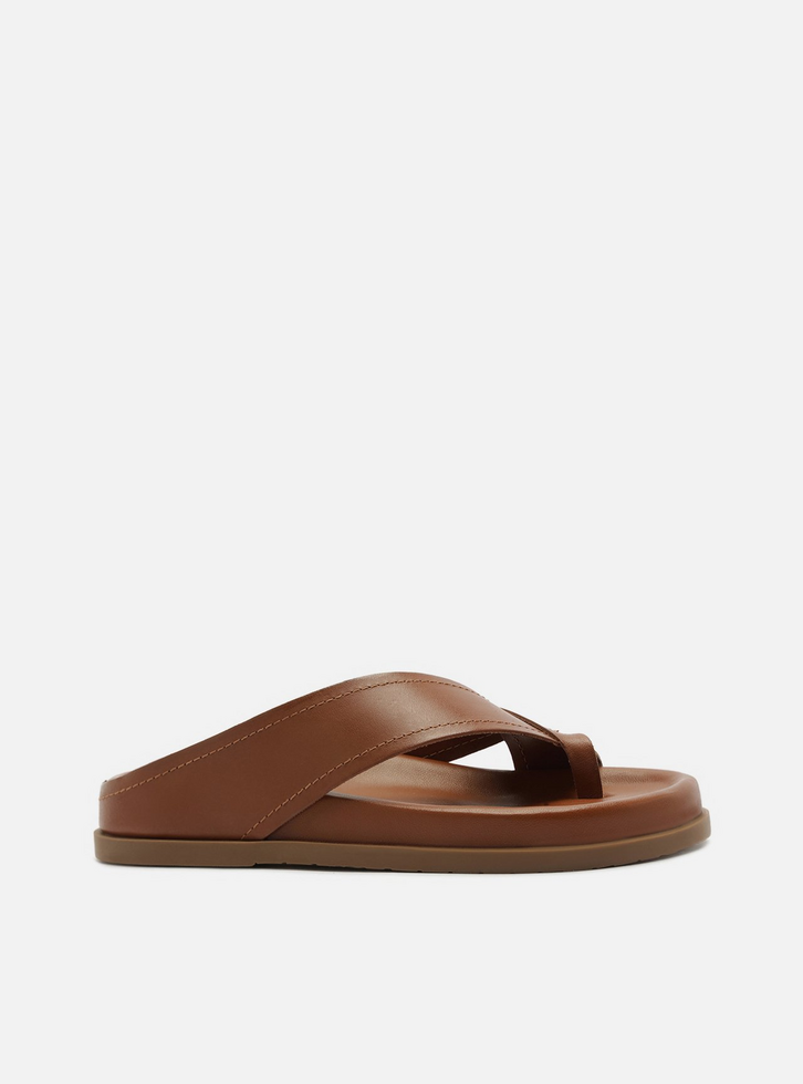 Sandália rasteira feminina marrom de couro. O sapato tem palmilha com formato anatômico e inscrição do nome da marca. Possui solado flatform, base emborrachada e formato arredondado na ponta. Traz tiras largas em couro que partem da parte superior do pé até o calcanhar, cruzam na parte frontal e dividem os dedos.