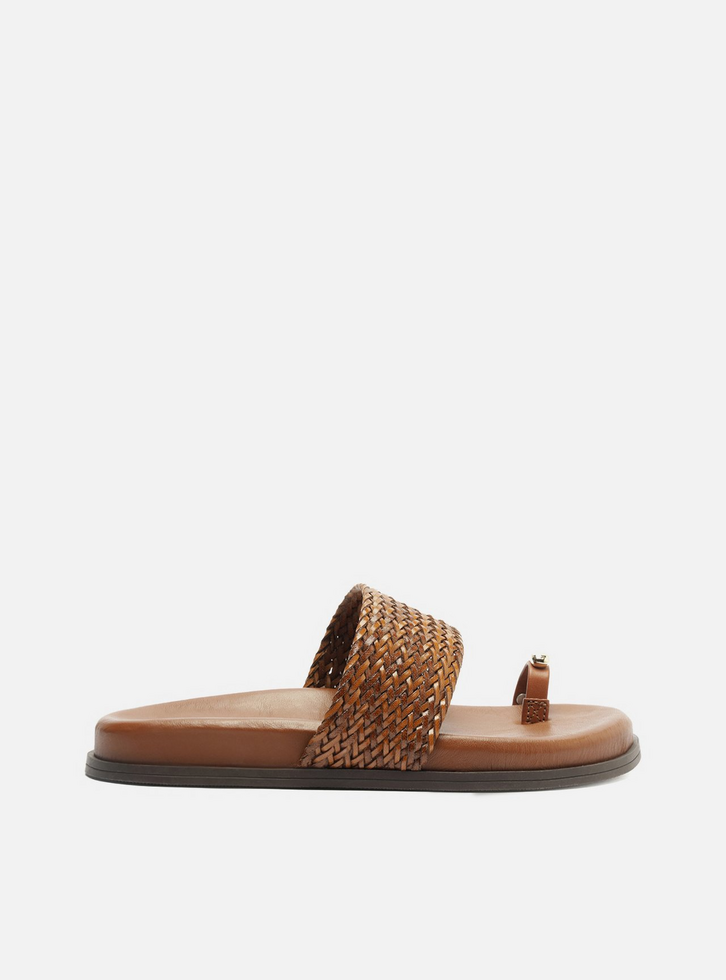 Sandália papete feminina marrom. O sapato tem salto rasteiro, palmilha marrom com formato anatômico e inscrição do nome da marca. Possui solado flatform, base emborrachada e formato arredondado na ponta. Traz tira larga em tressê na parte superior do pé e tira em torno do dedão com aplicação de metal dourado.
