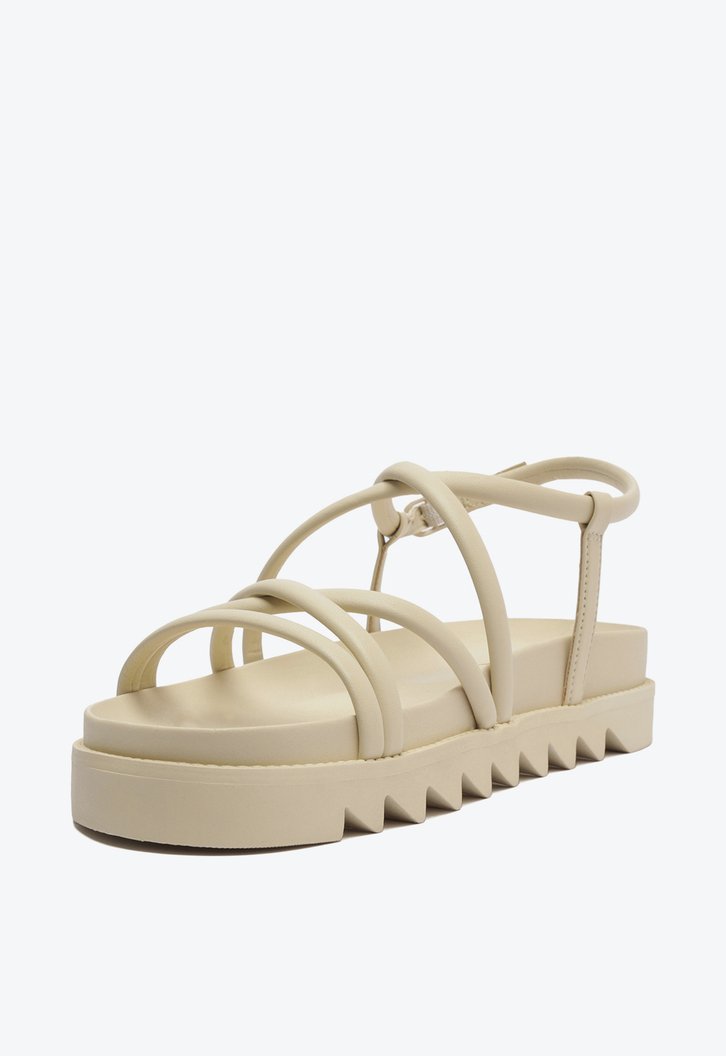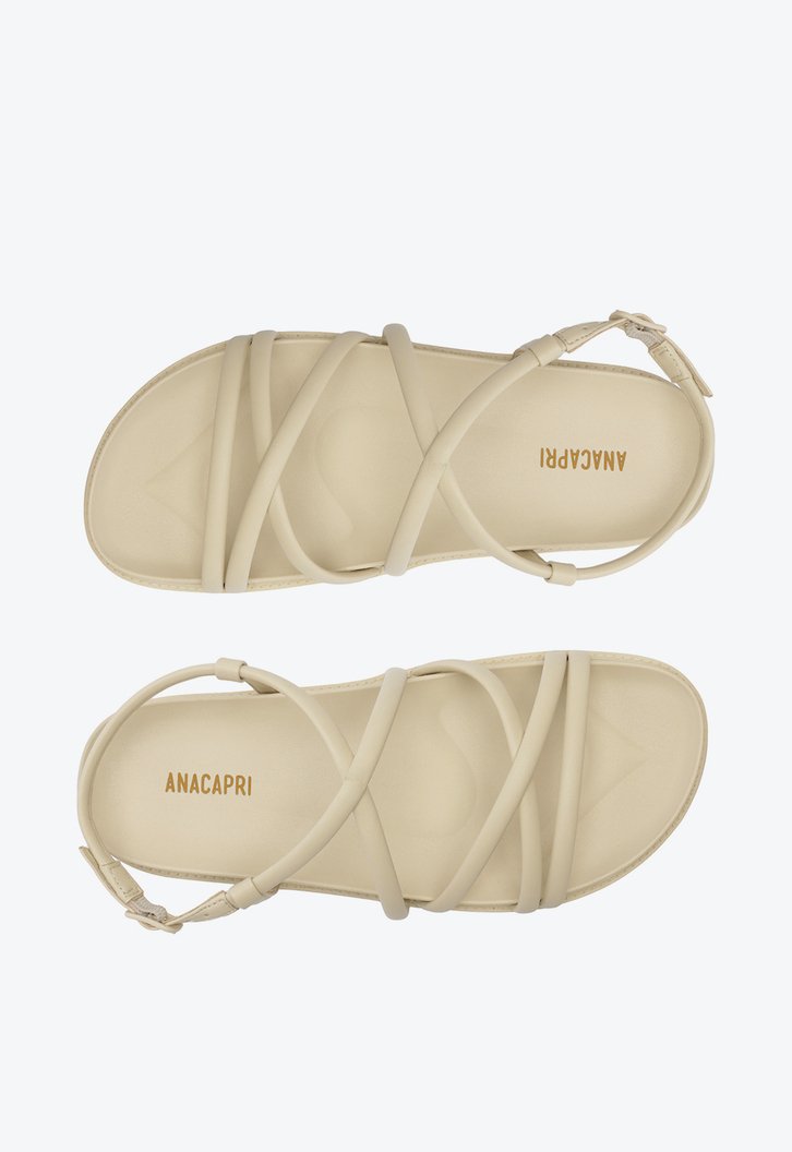Sandália papete Anacapri multitiras nude. O modelo de biqueira arredondada traz cabedal em tirinhas transpassadas sobre os dedos e outras duas presas pelas laterais que se cruzam no peito de pé, unindo-se em uma tira que contorna o calcanhar, com fecho superior em fivela lateral. Apresenta solado emborrachado tratorado e palmilha anatômica da mesma cor da papete, com assinatura Anacapri.