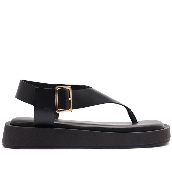 Sandália papete Nina, na cor preta. O modelo de material similar ao couro traz biqueira moderna quadrada. De salto flatform baixo, possui cabedal com tira única e central mais larga na gáspea, com design triangular e que separa os dedos. Ela segue até a pala abraçando o tornozelo e contorna o calcanhar, com fecho regulável em maxi fivela de metal quadrada na lateral. Apresenta palmilha acolchoada no mesmo tom da sandália, com assinatura Anacapri.